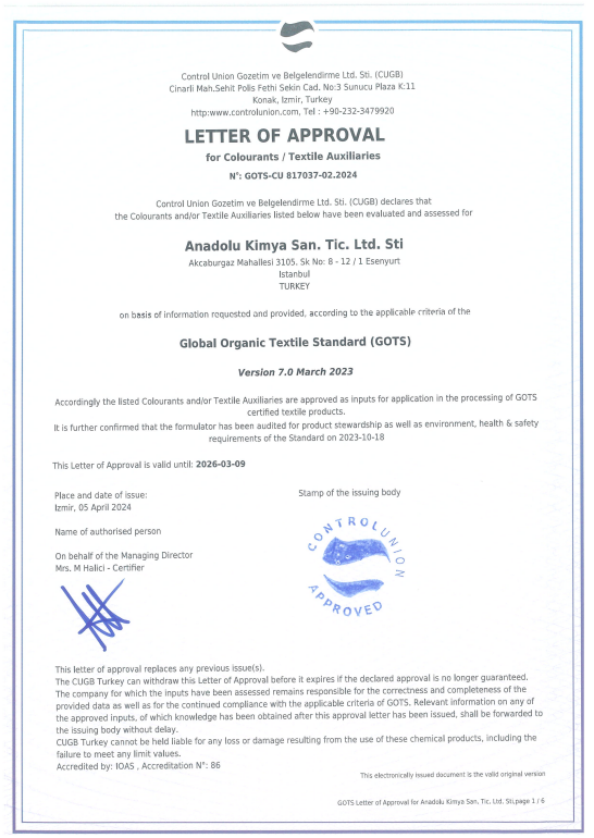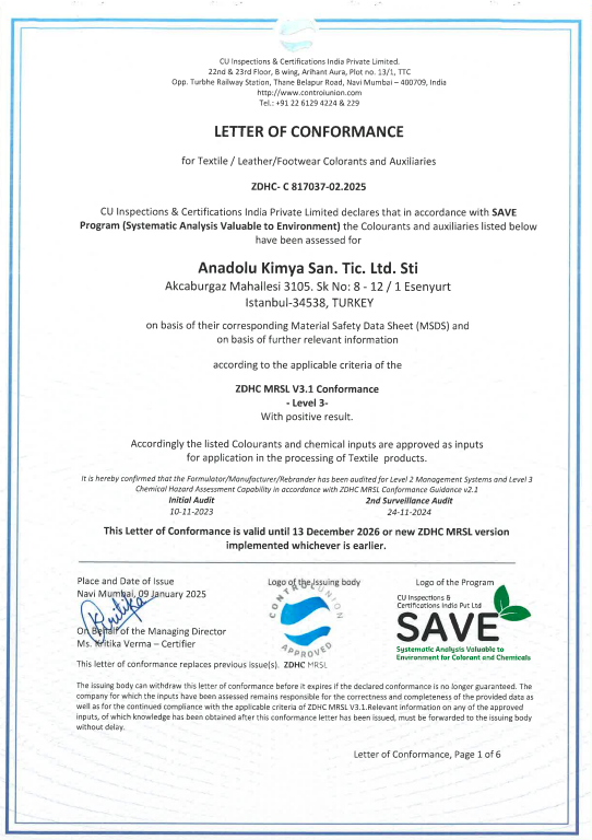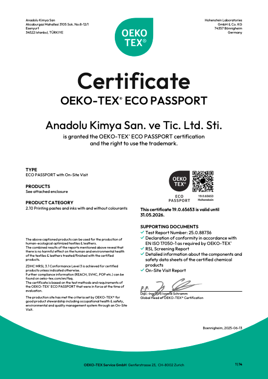 ISO 9001, ISO 14001, ISO 45001, ECO-PASS, GOTS ve ZDHC Level 3 sistemlerimiz sayesinde tüm ürünler eşdeğer performans sunar.